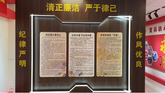 新建的党员活动室暨党风廉政教育中心按照“六有”标准,本着简约规范和一室多用的原则,布局合理、主题突出、特色鲜明,“入党誓词”、“党员义务”、“党员权利”、“三会一课”、“四个意识”及《党委(党组)落实全面从严治党主体责任规定》等党建基本制度齐全,并配有党旗、统一标识以及投影仪、会议桌椅等设施,可以充分保障党建活动开展的需求。活动室内设有党员风采墙,是对党员职工在日常工作中服务群众,为民奉献的生动体现,充分发挥出党员的先锋模范作用;图书角配备党建书籍、党报党刊等,激发党员干部多读书、读好书的兴趣,营造了人人爱读书的浓厚氛围;廉政教育中心以“六大准则”、“四种形态”、廉政细则、“以史为鉴”等内容展板组成,教育广大党员干部,忠诚、干净、担当,坚定走好新时代全面从严治党长征路。