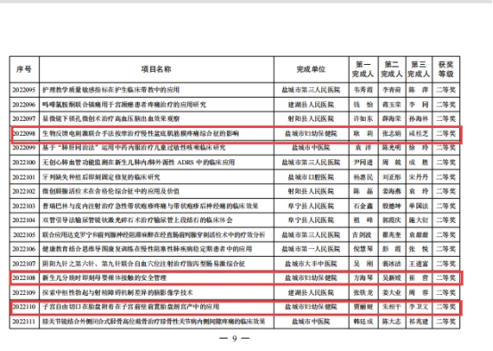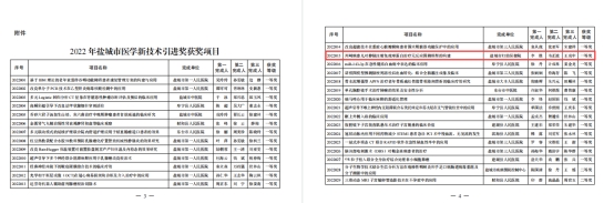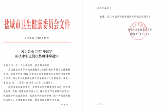 根据盐城市卫生健康委员会《关于公布2022年医学新技术引进奖获奖项目的通知》(盐卫规划【2022】33号),我院今年共获得7项医学新技术引进奖(一等奖1项,二等奖6项)。