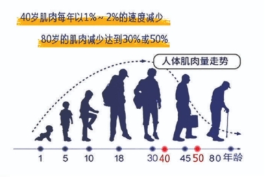 肌肉是人老化过程中质量丧失最多的部分。随年龄增长,肌肉的流失速度不断加快,肌肉质量不断下降。30岁以后,每十年骨骼肌量减少3-8% ,50岁以后每年减少1-2%,60岁人群肌少症发生率大约30%,80岁约50%。当肌肉质量<70%时,被认为是死亡风险较高的区域。