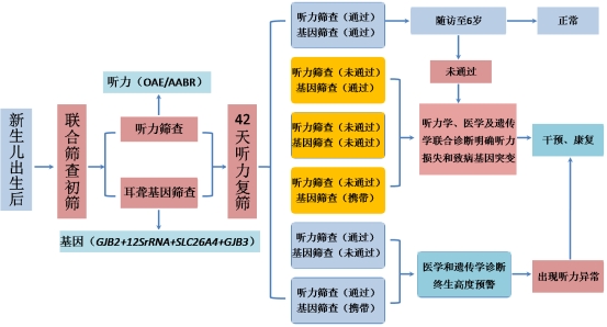 基因筛查必须联合听力筛查,如同前面提到的,基因筛查只是检测最常见的耳聋基因的最常见的热点变异位点,对那些相对低发的耳聋基因或所筛查基因的罕见变异位点,常规的筛查方式可能会出现漏筛。因此,即使联合筛查通过也不能说明就完全没有耳聋遗传的问题。此外,在遗传性听力损失中,除了先天性听力损失外,还有迟发性或进行性听力损失,即出生和幼年时期听力正常,进入青春期或成年后才出现听力损失,虽然发现了一些基因与这个现象关联,但这部分疾病的机制尚不是十分明确,还可能与噪声等环境因素相关。因此,基因筛查通过只是说明新生儿没有携带中国人群最常见的耳聋基因变异,同时必须结合听力筛查的结果以及各年龄段的听力检查随访情况等综合评估,并不能代表终生的情况。