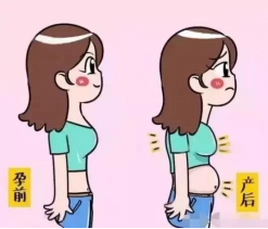 腹部外形可能因重力作用导致局部松驰皱褶的皮肤和皮下脂肪不断下移形成悬垂腹,形状如“麻袋裹腹”,伴有明显的体型和姿态改变,可能伴有皮肤松驰,皮肤皱褶重迭下垂。由于严重影响体态美观,处于敏感期的产妇产生很大的精神和心理压力,出现自卑、自厌、封闭等不良情绪,造成了沉重的心理负担。