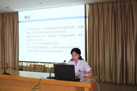 培训会上,儿科张桂芹主任分别详细讲解了中东呼吸综合征和手足口病的病原学、流行病学、发病机制、临床表现、影像学、实验室检测与诊断等方面的内容,接着由院感办郑冬梅主任介绍了中东呼吸综合征最新疫情分布情况,并根据国家卫计委发布的中东呼吸综合征院感防控指南,指导大家如何做好中东呼吸综合征的院感防控工作。