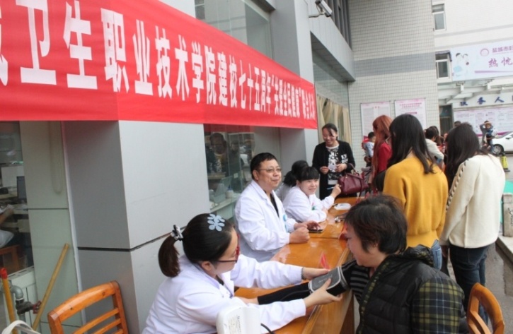 10月15日上午,为庆祝盐城卫生职业技术学院建校七十五周年,我院作为该校附属医院在本院举办了一场以“关爱全民健康”为主题的联合义诊活动。儿外科朱鸿喜、妇瘤科马汝婵、内分泌科潘铁梅、乳腺科凌晓红等专家主任在医院门诊楼广场开展了义诊活动。咨询活动现场井然有序,医务人员热情地为市民免费量血压、测血糖,细致和耐心地解答群众的各种医学问题,让他们满意而归。经统计,近150人次参加了咨询活动,量血压近50人次,测血糖近30人次,其他健康咨询100余人次。