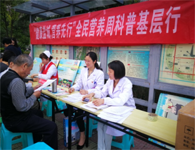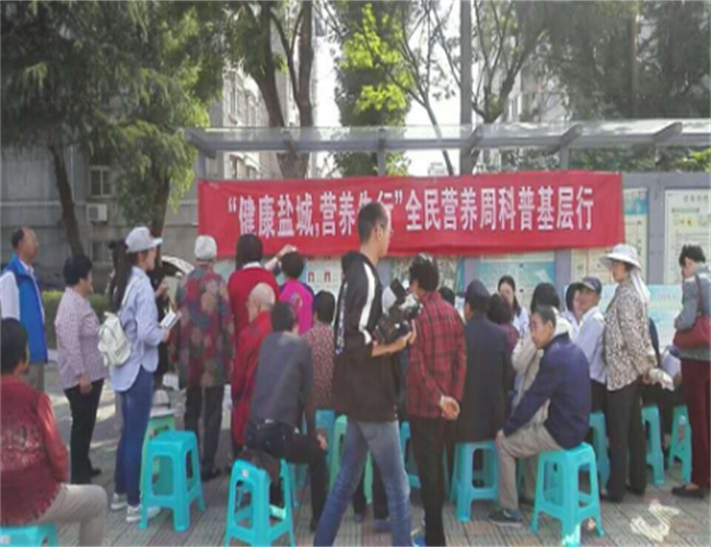 为提高全民营养意识,促进健康生活方式,推广健康饮食新风尚,由江苏省营养学会、盐城市营养学会、盐城市图书馆联合主办的“健康盐城,营养先行”全民营养周科普基层行活动分别于2017年5月14日在钱江方洲社区,2017年5月16日在黄海街道南苑社区举行,我院临床营养科营养师陈春霞、鲍丹凤参加了此次推广活动。