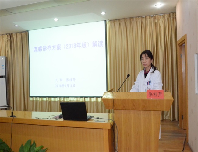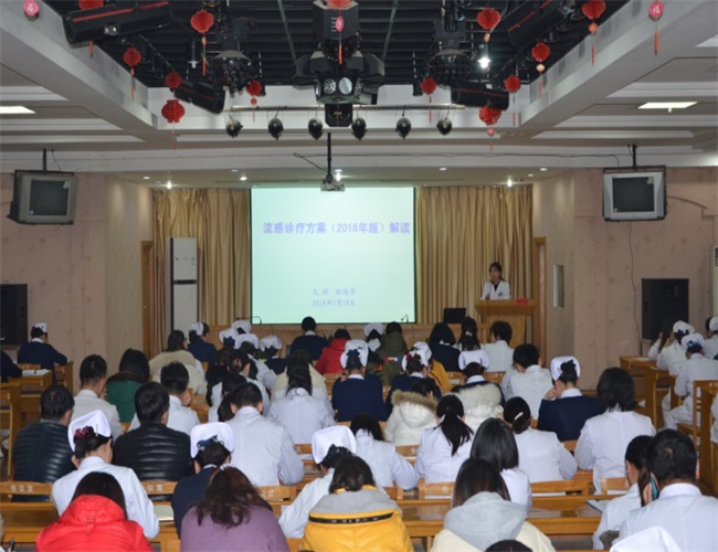 本次培训由医务科郭霞科长主持,首先传达了国家卫计委关于做好2018年流感防治工作视频会议精神和《关于做好2018年流感防治工作的通知》国卫发明电[2018]1号文件精神,随后儿内科张桂芹主任对国家卫计委下发的《流感诊疗方案(2018年版)》进行了详细讲解,讲解内容包括流行性感冒病原学、流行病学、发病机制及病理、临床表现和实验室检查、诊断、鉴别诊断、治疗及预防等相关知识,并从中医中药角度讲解了流感防治知识。