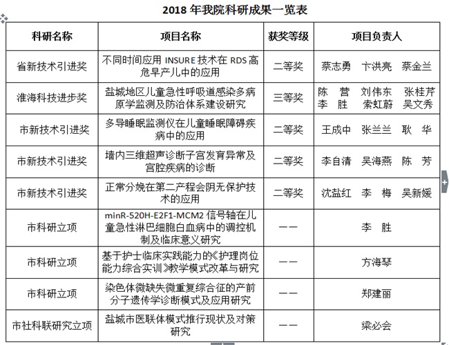 2018年,在院领导的关心与支持下,经全院医护人员的共同努力下,我院在科研领域取得了不错的成绩。按照省市级科研申报要求,经过组织申报、专家评审等环节,最终我院获省级新技术引进奖二等奖1项,淮海科技进步奖1项,市级新技术引进奖二等奖3项,市级科研立项3项,市级社科联应用研究立项课题1项。
