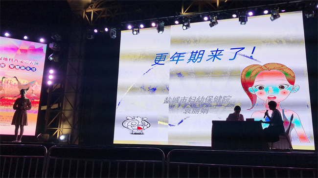 9月18晚,由妇女保健科硕士、主治医师袁丽娟主创的科普秀《更年期来了》,被市科协、市医学会选拔到盐城高新区欧风花街舞台进行表演,由袁丽娟、廖文梅、王甜甜三人组团的情境性表演更年期的科学知识,令人耳目一新,深入浅出、形象生动的科学普及赢得阵阵掌声,受到大家欢迎和好评。 (吴文秀)