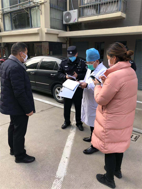 ▲赵广华同志同社区民警、街道干部、村医生在新河街道对武汉返盐人员进行居家医学观察。