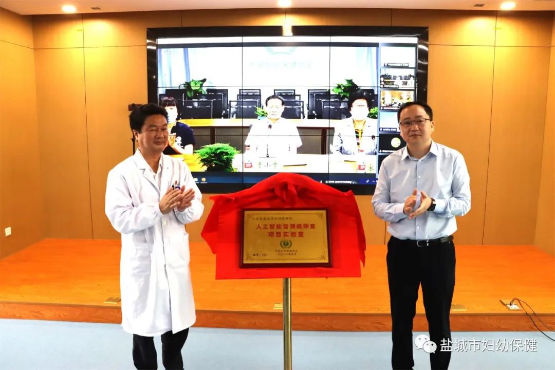盐城市卫生健康委员会副书记、副主任王正,盐城市妇幼保健院党委书记朱向军为盐城市“市级人工智能宫颈癌防治技术中心”揭牌。